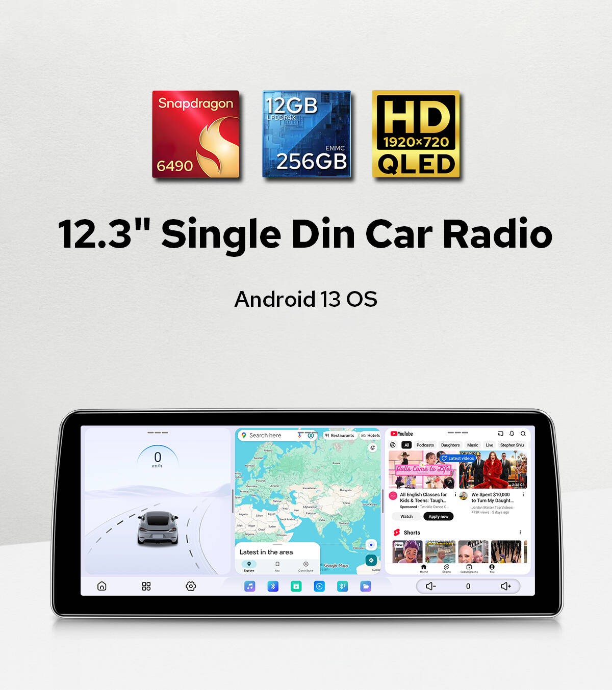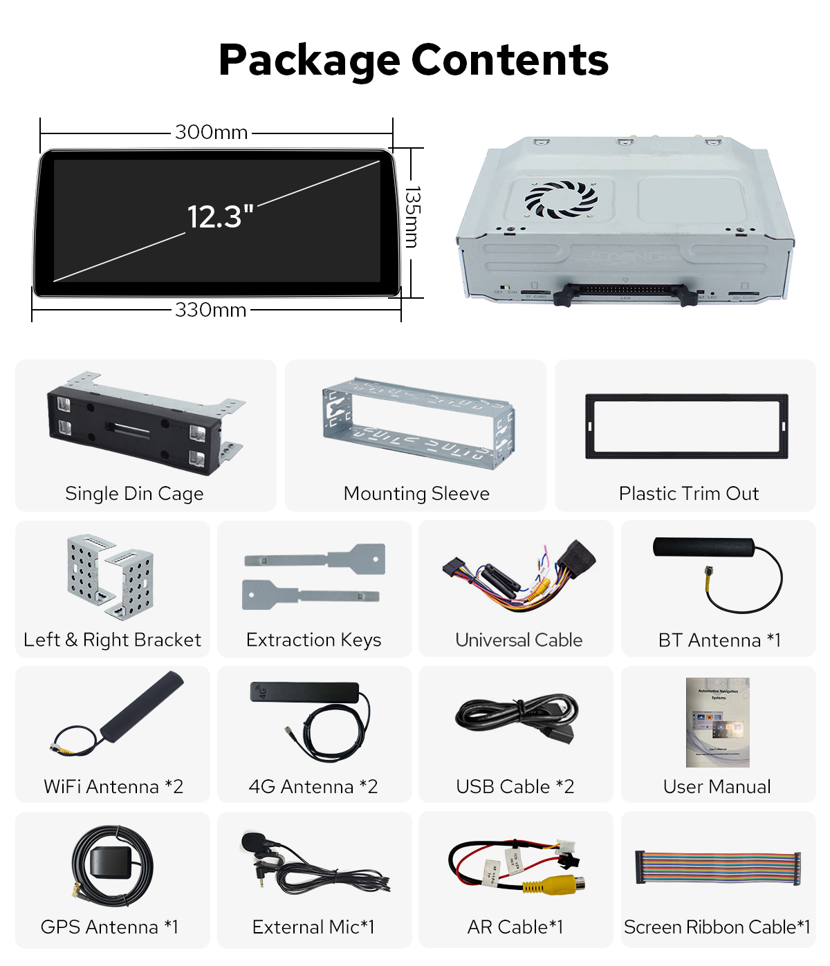 Note: This 12.3-inch universal car stereo features a standard 300X330X135mm (Single DIN) size and comes with a universal ISO harness for broad compatibility.