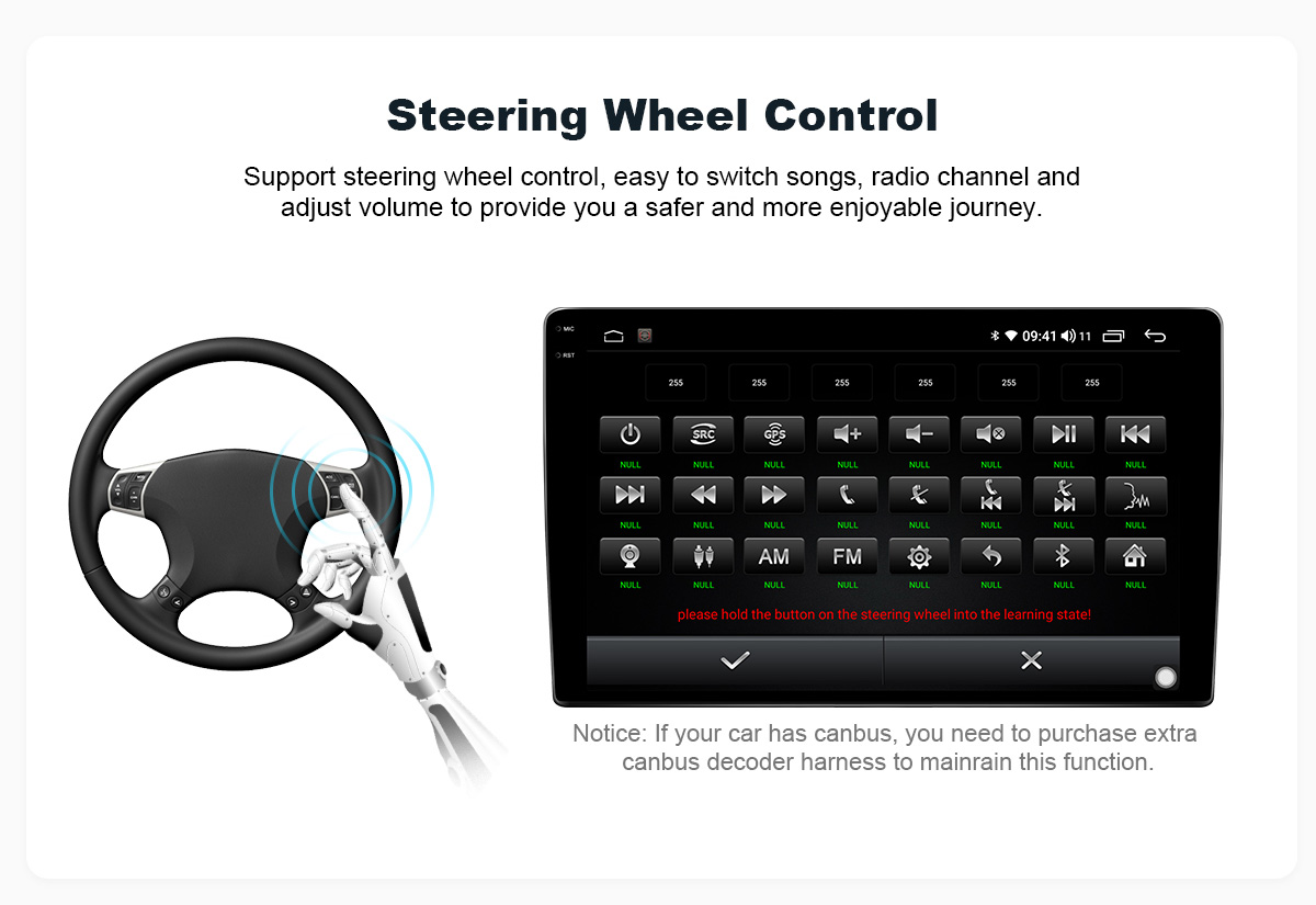 | SWC | Support factory steering wheel control, some vehicles may need special canbus harness |