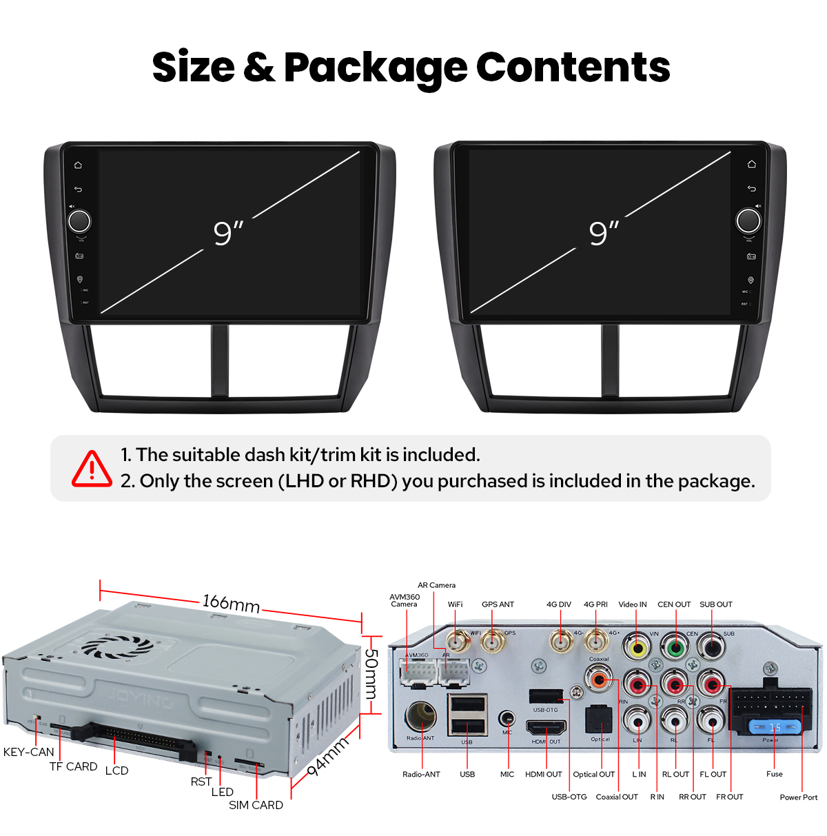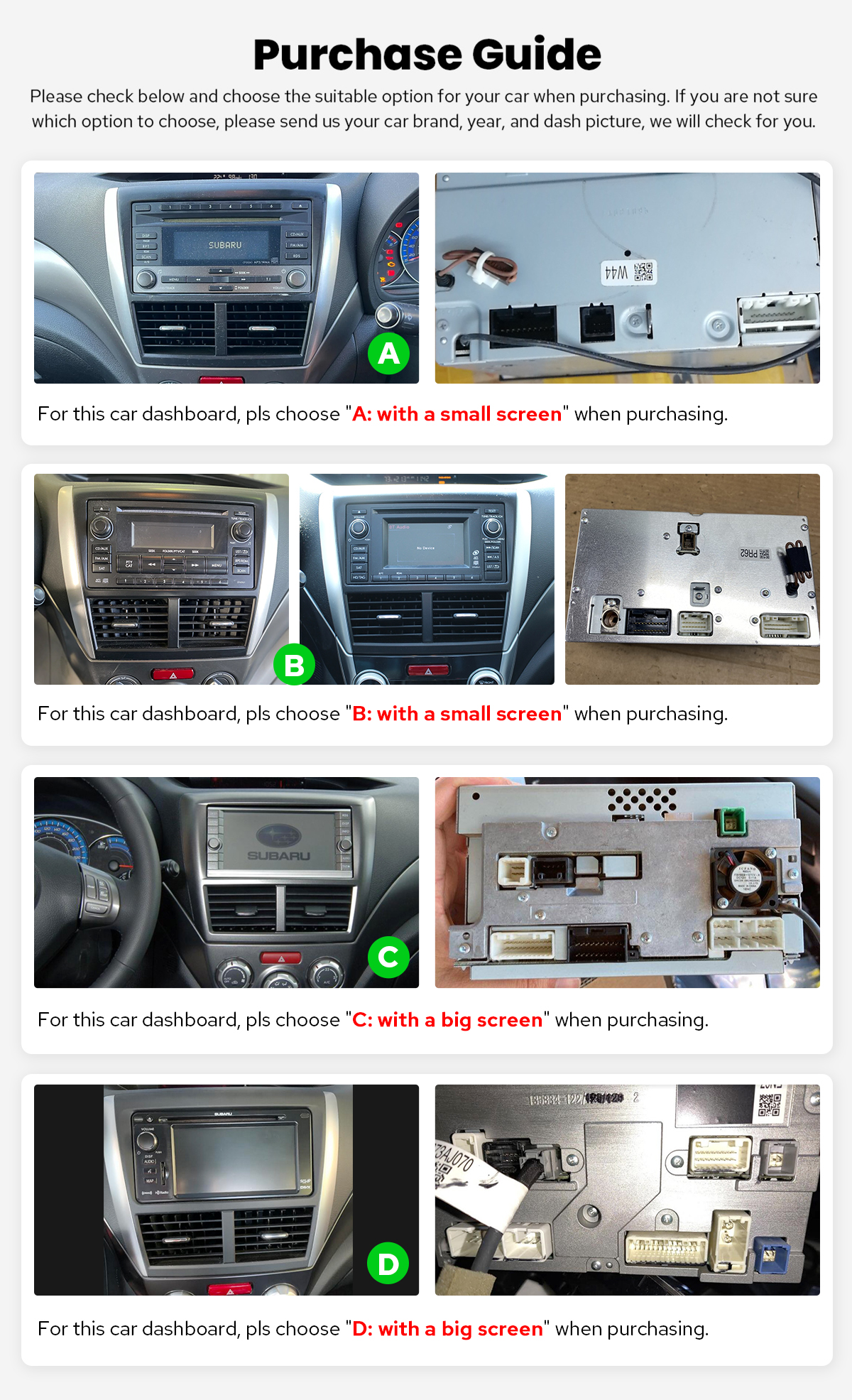 Note: 100% Compatible with Subaru Forester 2008-2012/ Impreza WRX 2007-2011 aftermarket stereo- True Plug & Play Harness/Retains Original Steering Wheel Controls/Works with OEM Backup Camera/No Cutting Wires Needed. More details please check below. If you are not sure whether this head unit can fit your car, pls send your car model, years and dashboard picture to europe@joyingauto.com, we will help you confirm it.