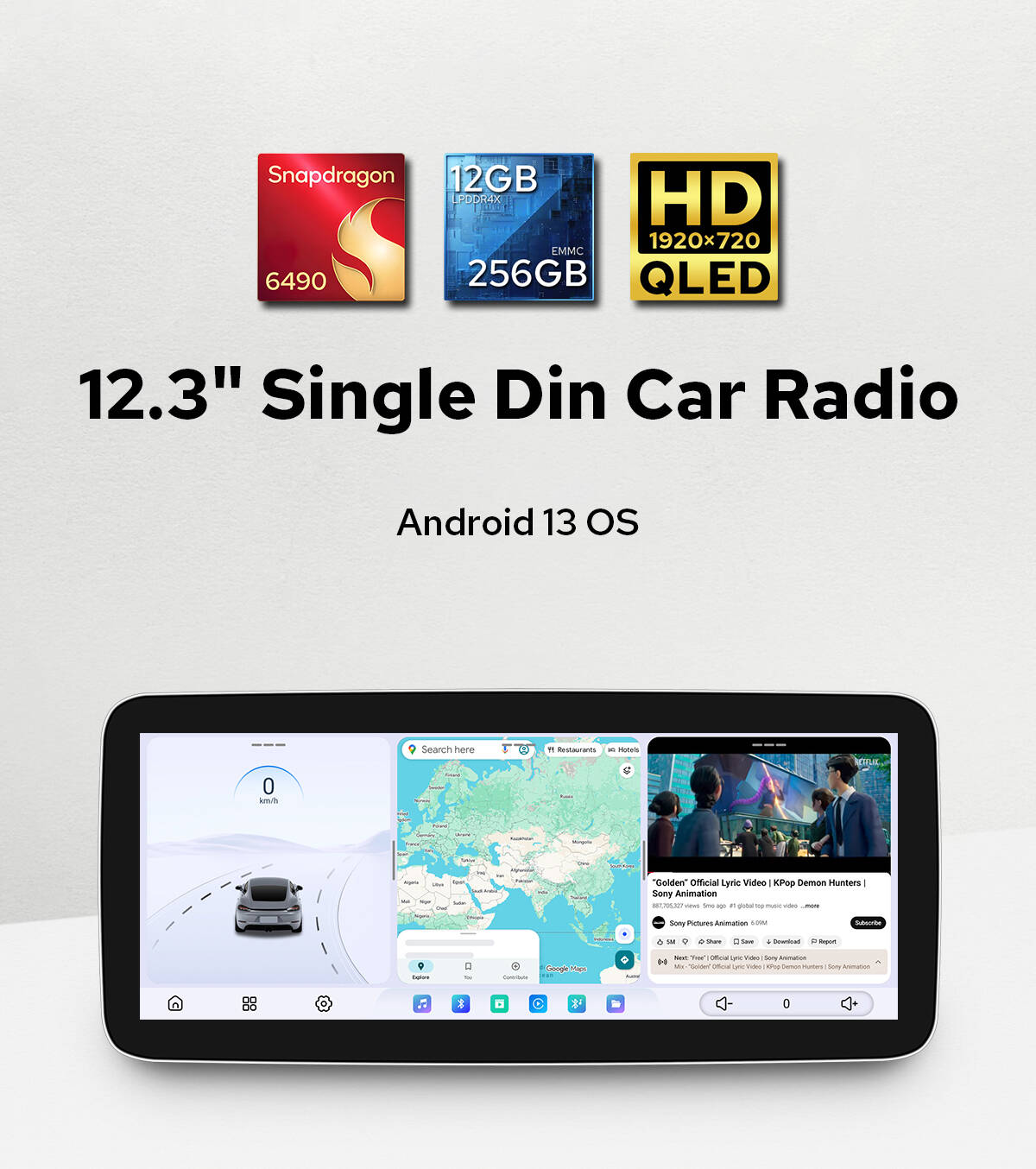 Most Powerful Android 13 Autoradio 12.3 Inch Single Din Car Stereo Upgrade with 5G Wifi