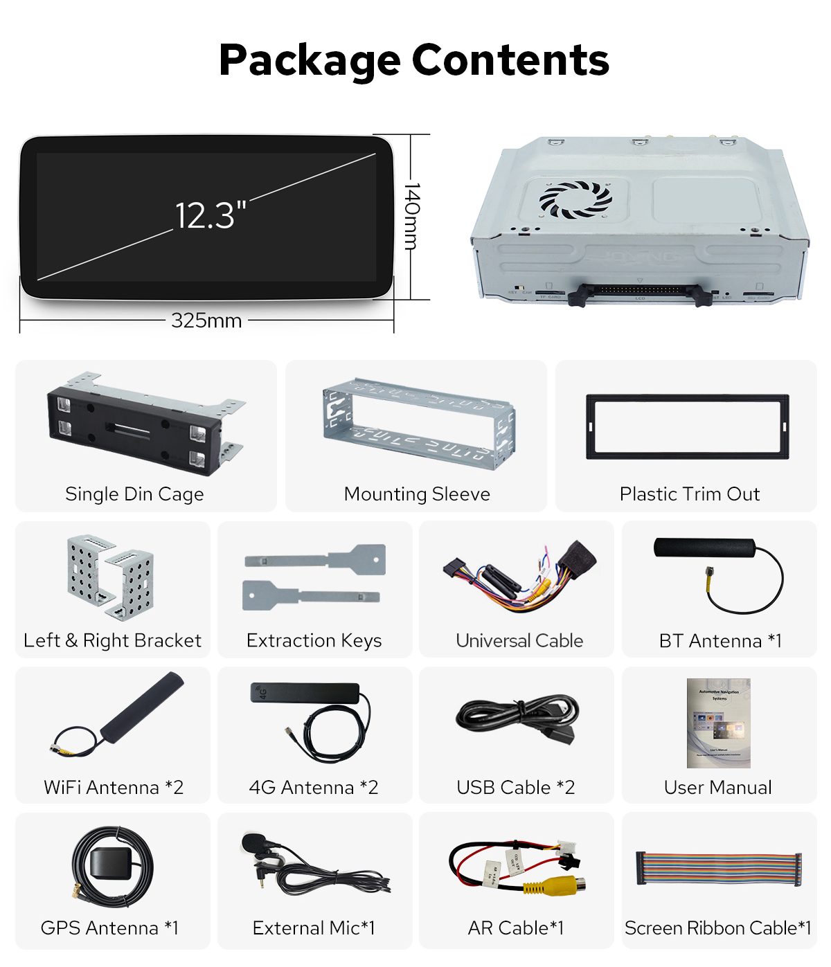 Note: This 12.3-inch universal car stereo features a standard 325X140mm (Single DIN) size and comes with a universal ISO harness for broad compatibility.