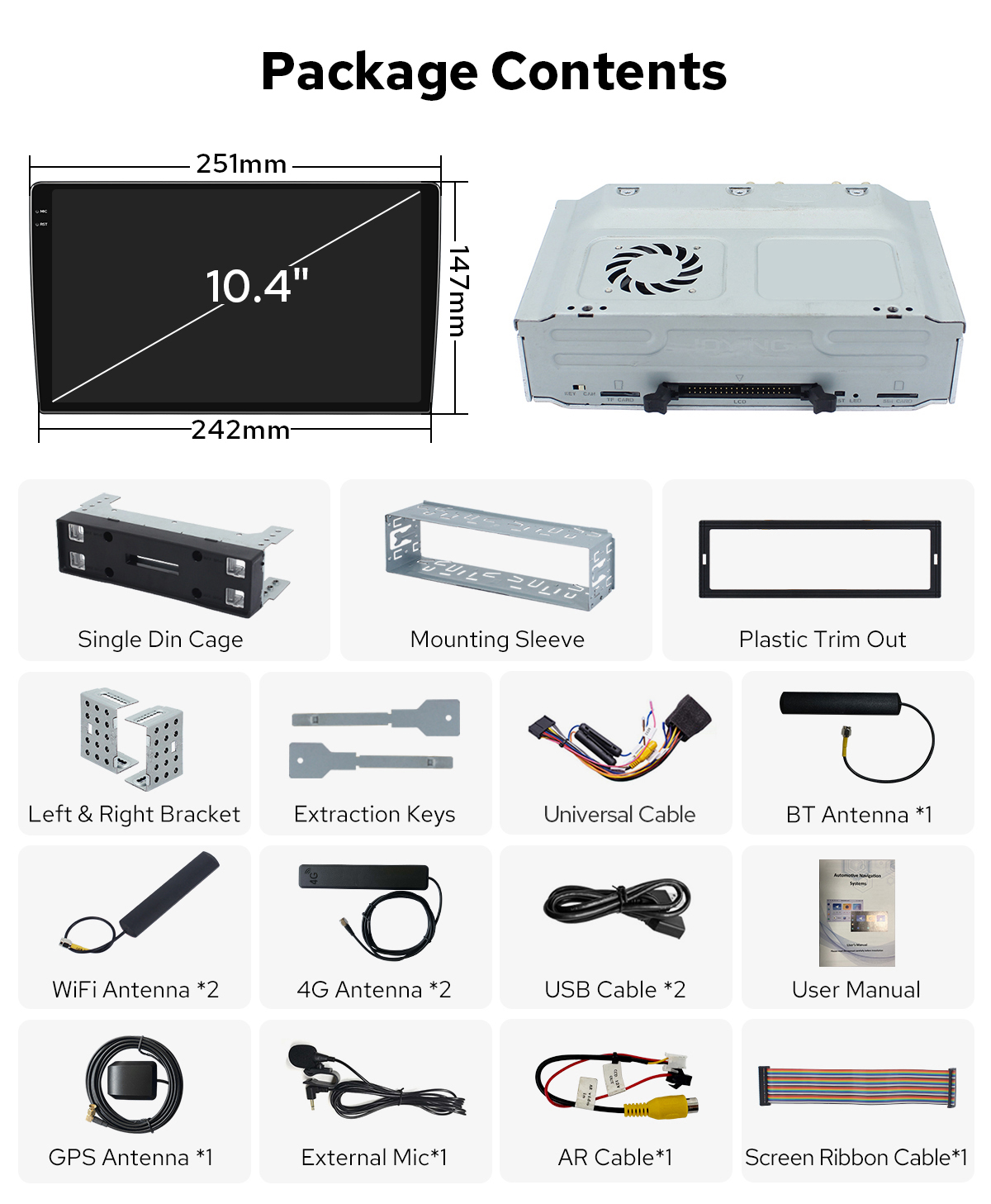 Note: This 10.4-inch universal car stereo features a standard 251X242X147mm (Single DIN) size and comes with a universal ISO harness for broad compatibility.
